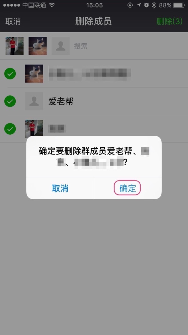 界面将跳转到“删除成员”,点击要删除成员左侧的圆圈,使之变为“”绿色对勾“”图标,全部选好后,点界面右上角的“删除”按钮