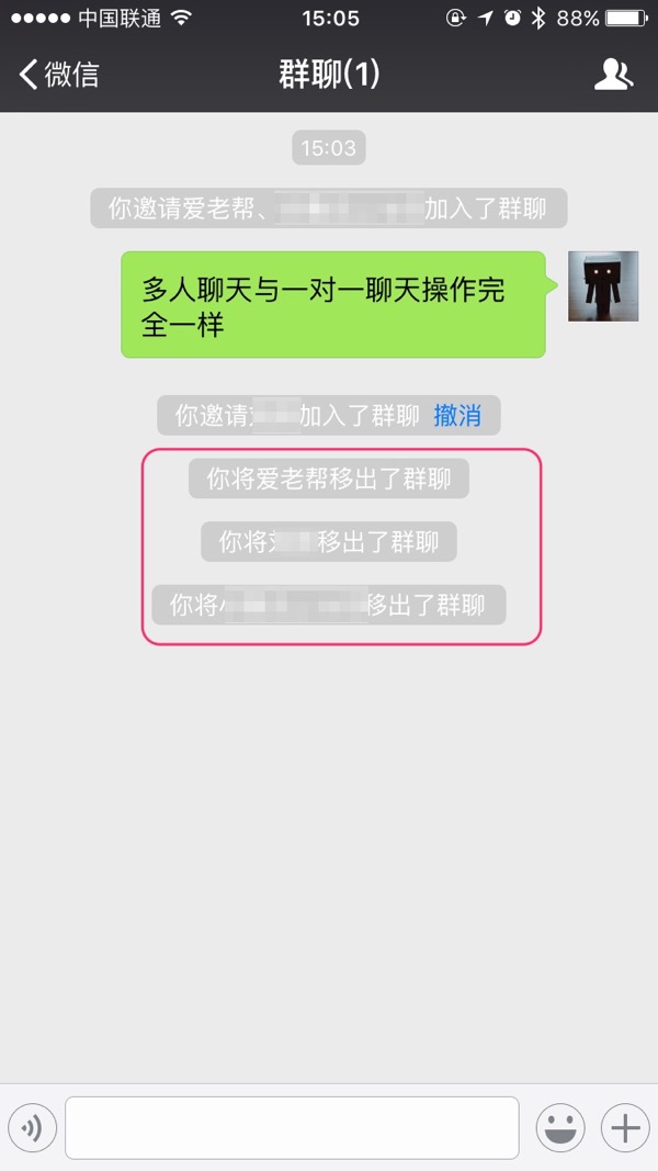 成员删除后聊天界面中会出现删除成员的提示信息,该提示信息群内所有成员都会看到