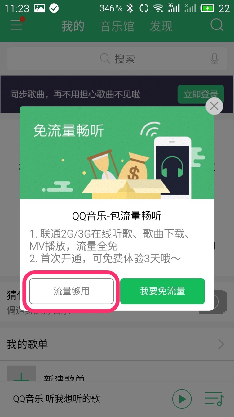 在“QQ音乐”运行时有时会询问您是否开通一个“QQ音乐包流量畅听”服务,开通这个服务后您在数据网络(3G/4G)听音乐的时候不会消耗流量(不花钱),价格为每月9元,如果您只在WIFI(无线局域网)环境下听歌或只听您手机中的音乐可以不用理会,点“流量够用”即可关闭这个提示框