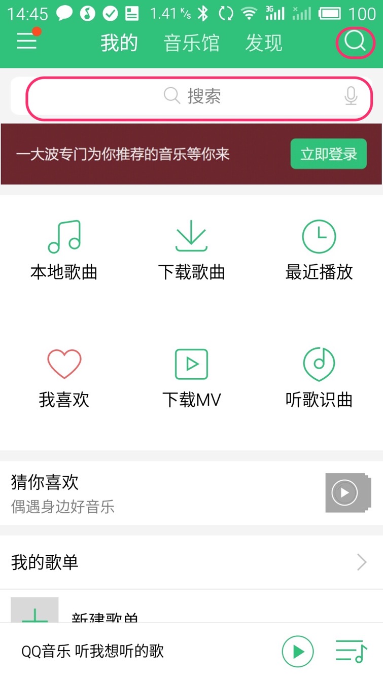 如果您知道要听音乐的名字可直接搜索,点屏幕上方的搜索框(红色线框内区域)或右上角的“放大镜”图标均可进入搜索界面