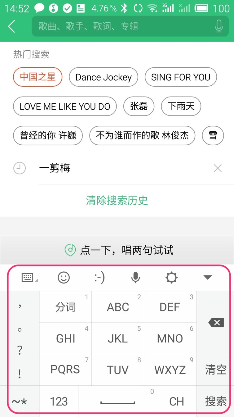 进入搜索界面后您可以直接通过界面下方打键盘输入要听音乐的名称
