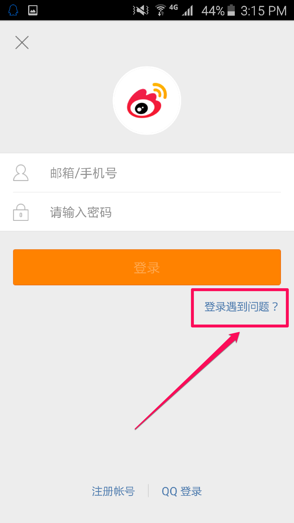 如果您忘记微博账号的密码,请点击首页的”登录遇到问题“