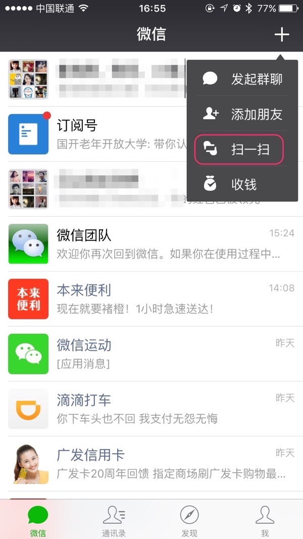 打开微信,选择右上角的“+”,点击“扫一扫”