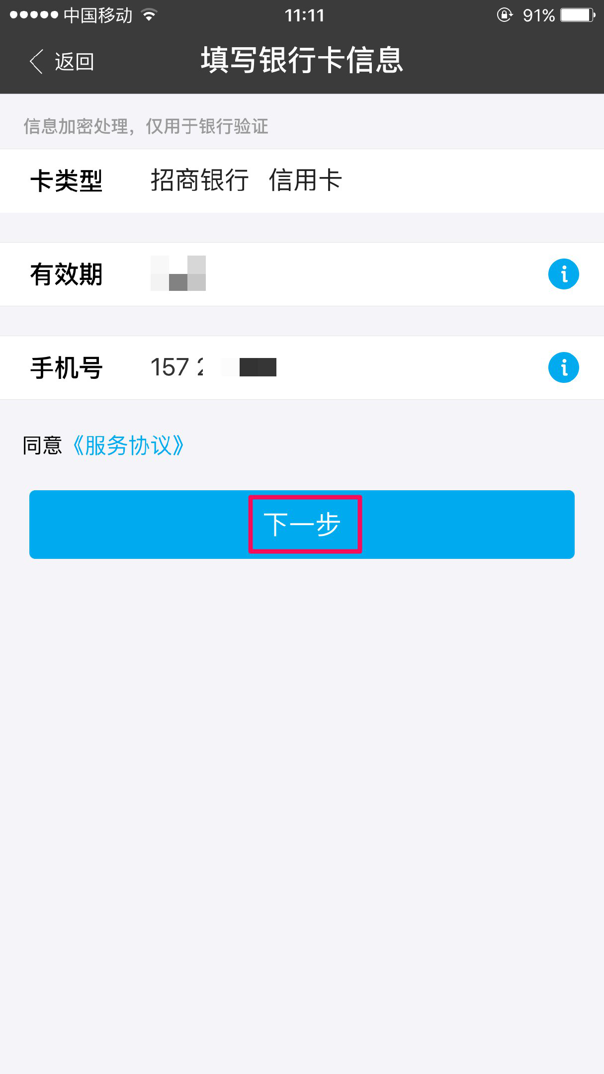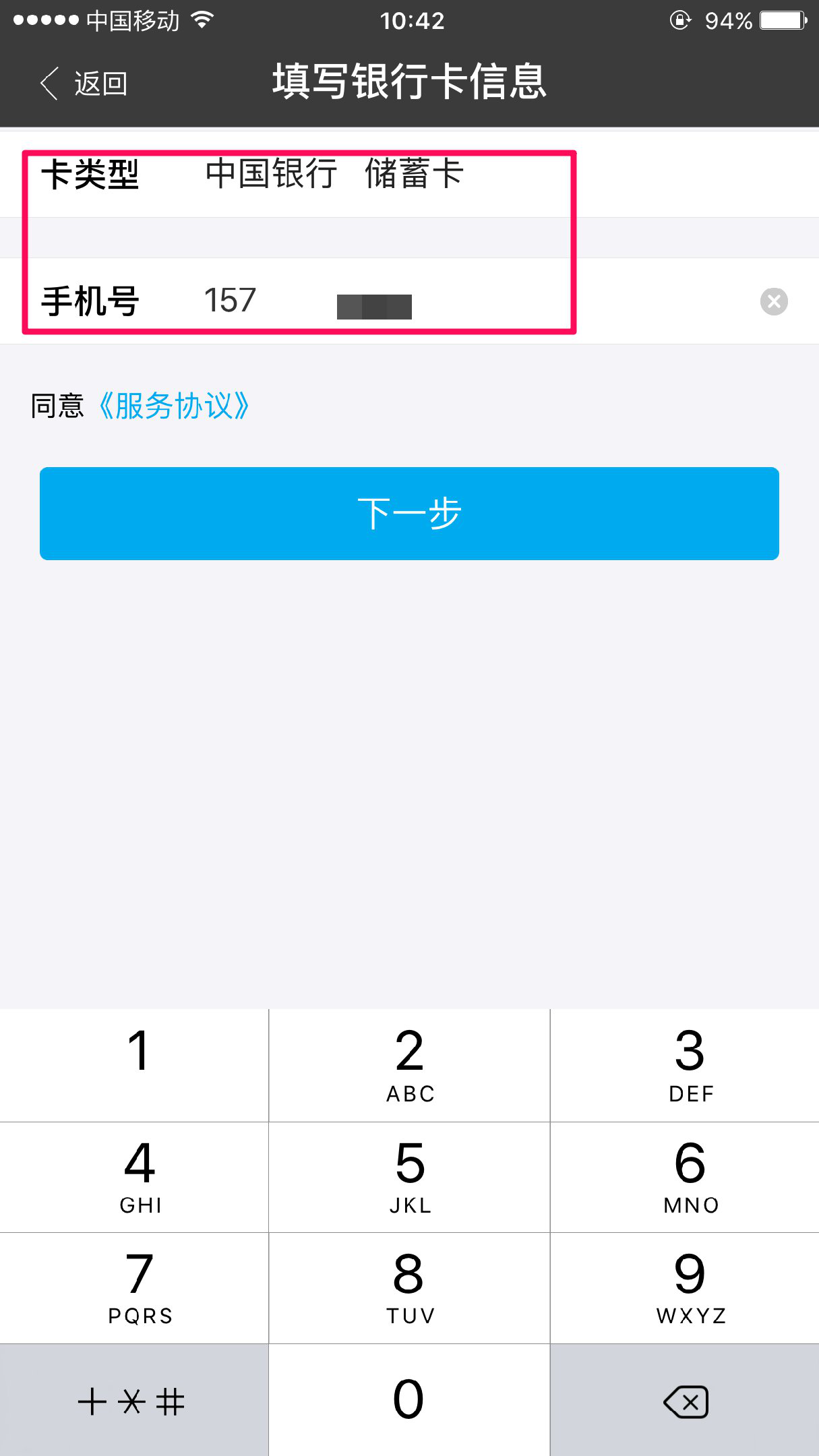 跳转到如下页面,填写储蓄卡类型与该银行卡在银行预留手机号