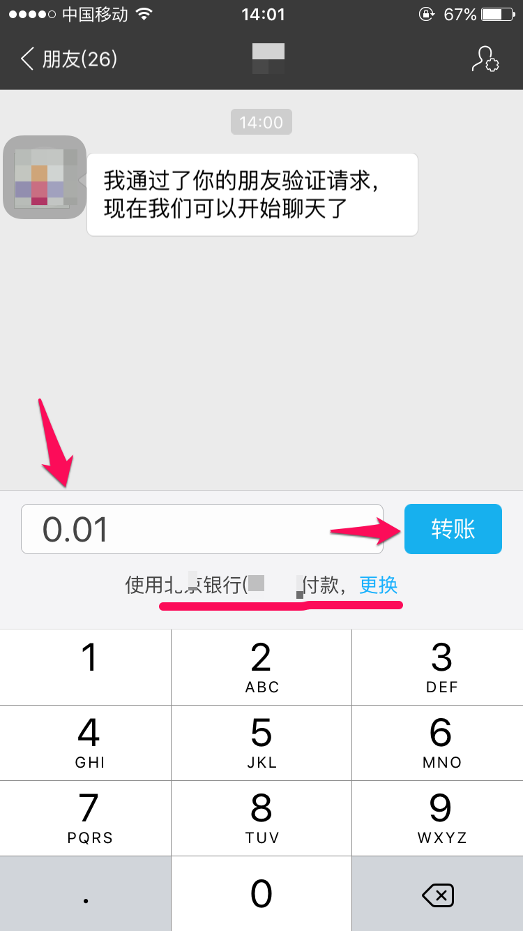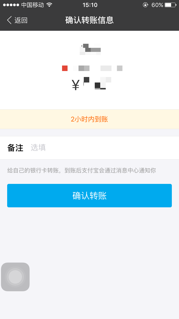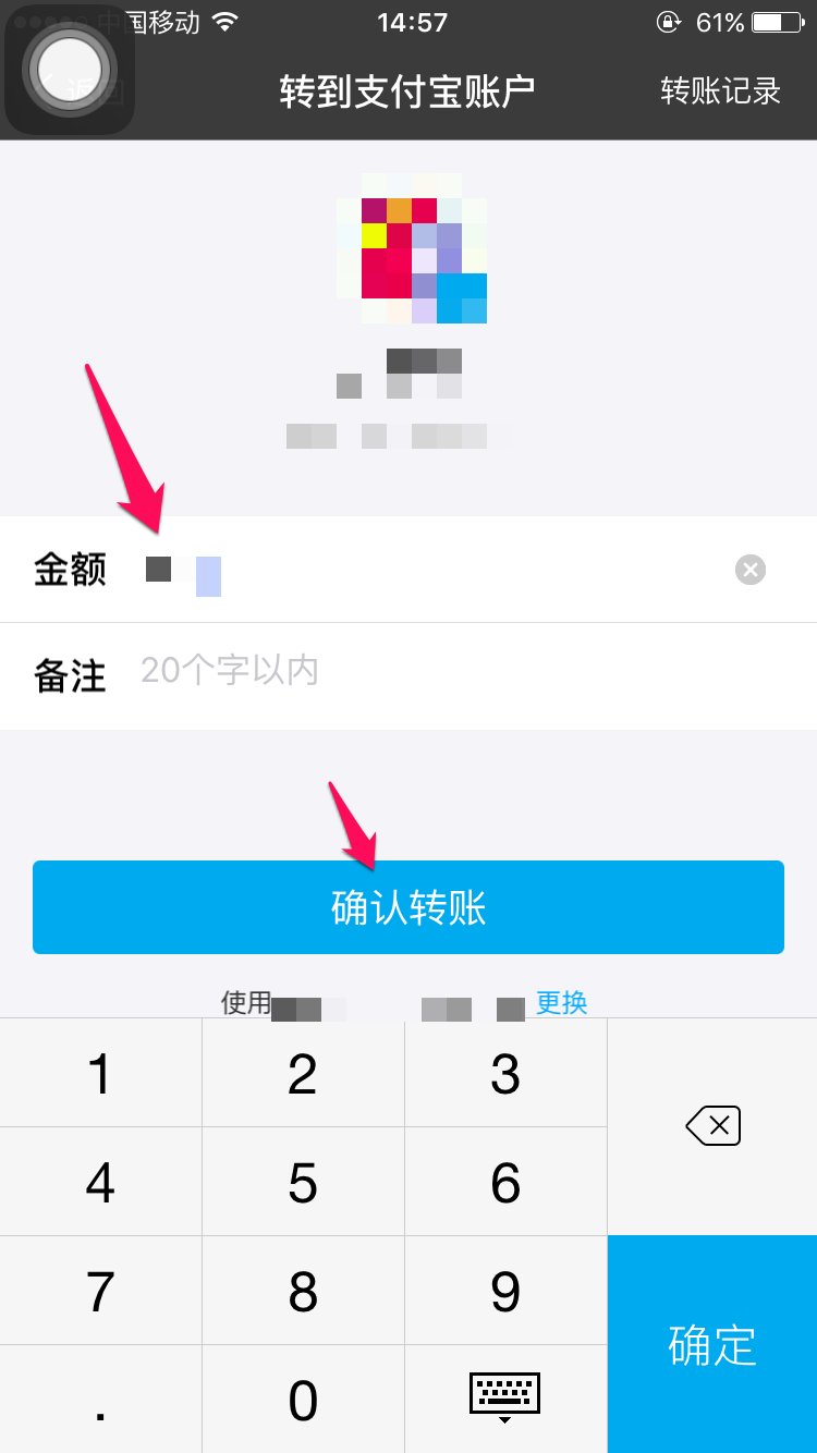 输入要转账金额,确认后点击“转账”。如果您有多张银行卡,可以点击蓝色小字,更换支付方式