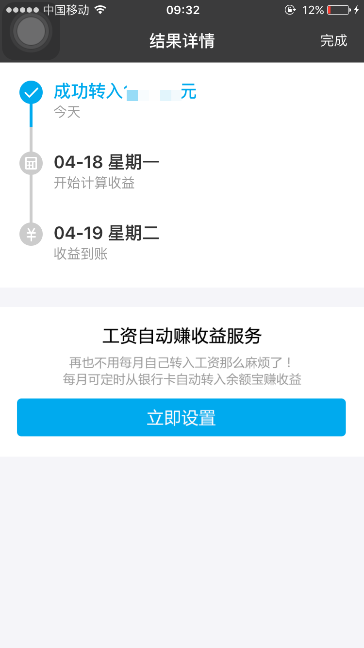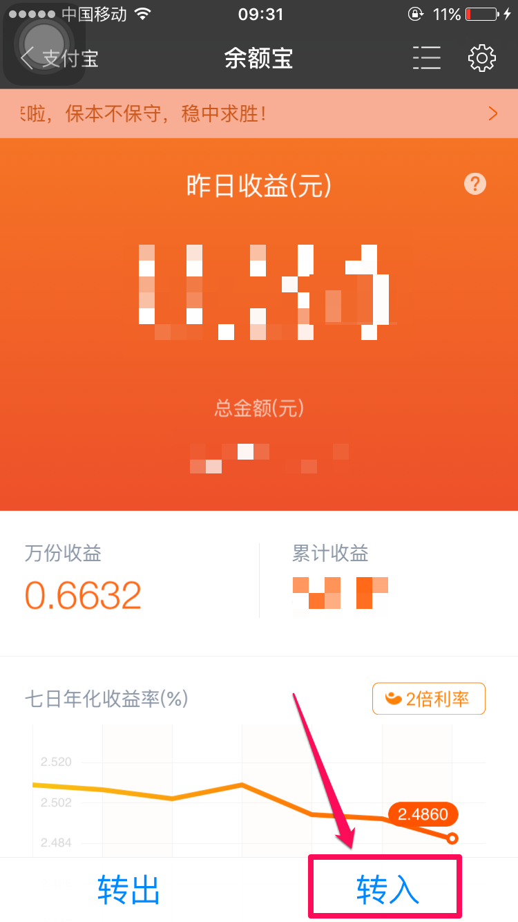 转账金额即时到账,并于3日后开始计算收益,第4天收益到账