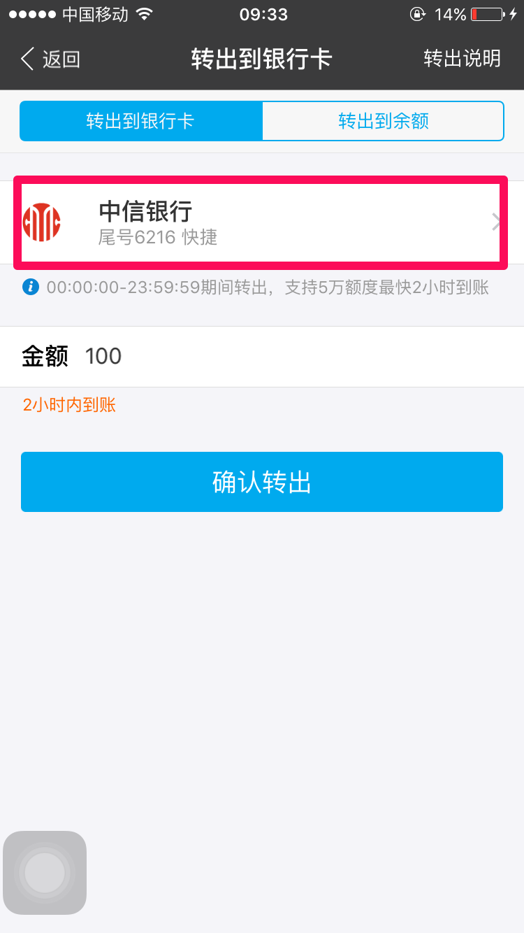 点击下图位置,选择要转出的银行卡
