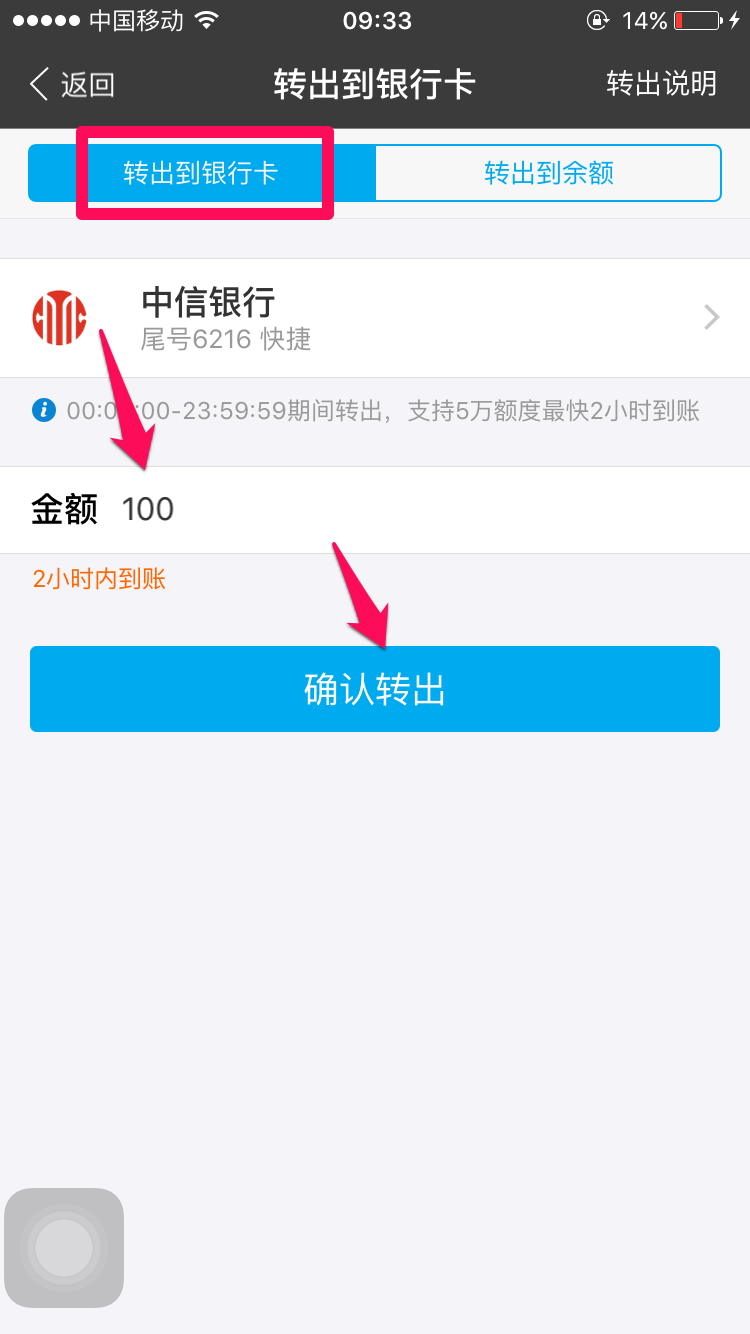 选好要转出的银行卡后,输入要转出的金额,点击确认转出