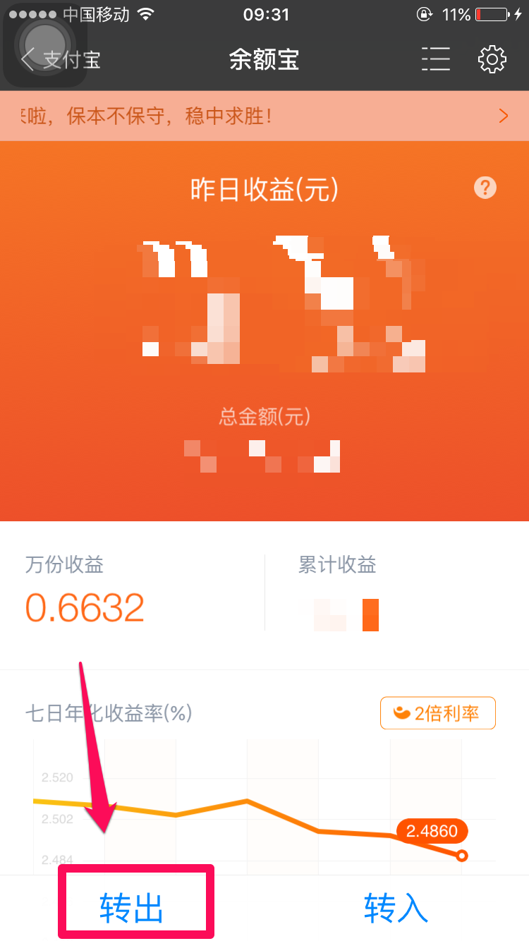 进入余额宝界面,选择右下角“转出”,点击进入