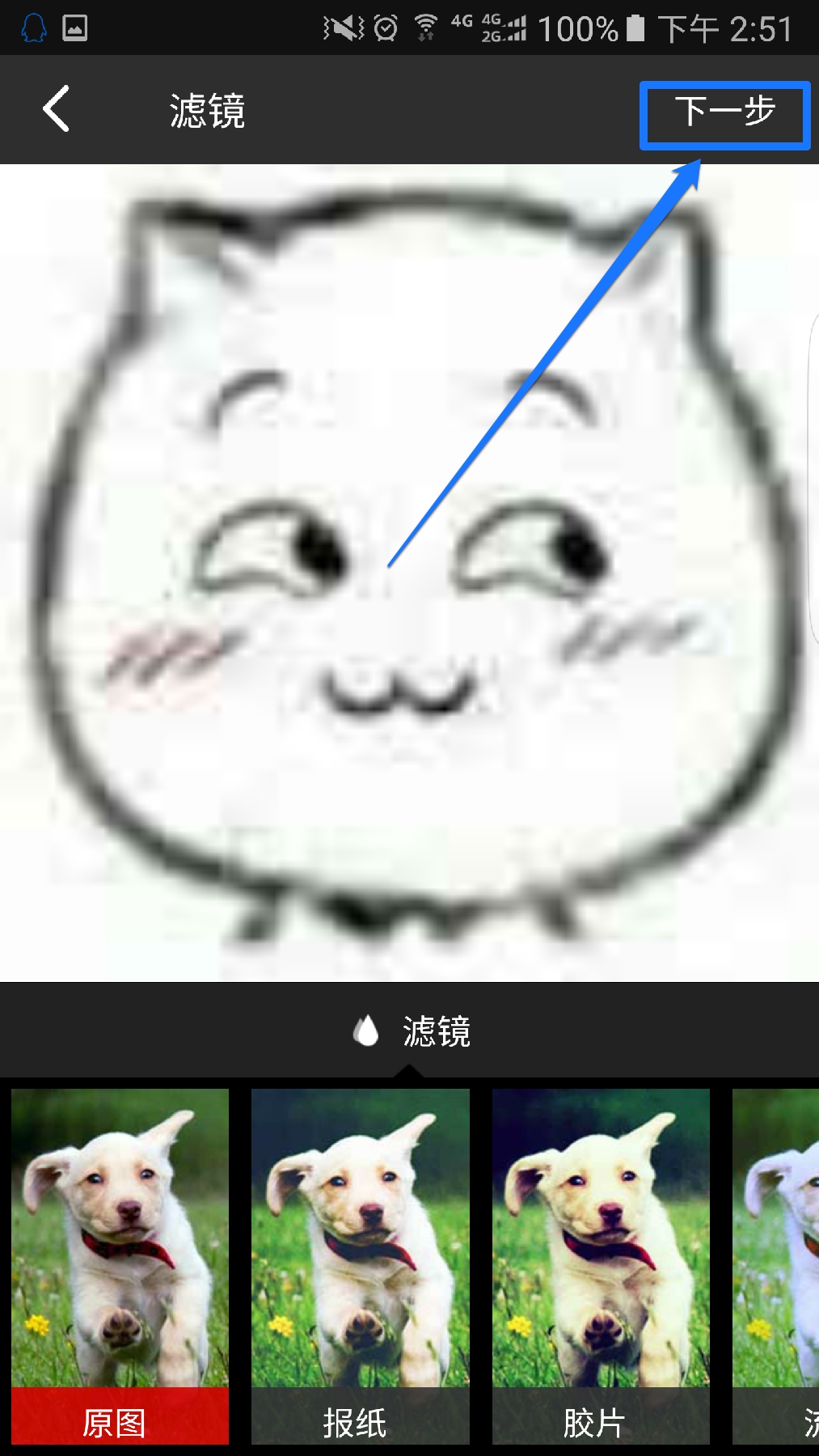 此处可根据需要增加滤镜(让照片看起来有不同的风格)。选好后点击“下一步”
