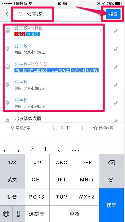 我们以从当前位置(五棵松)到公主坟为目的地进行路线查询,首先需要搜索要去往的目的地。如下图所示,在红框内搜索地点