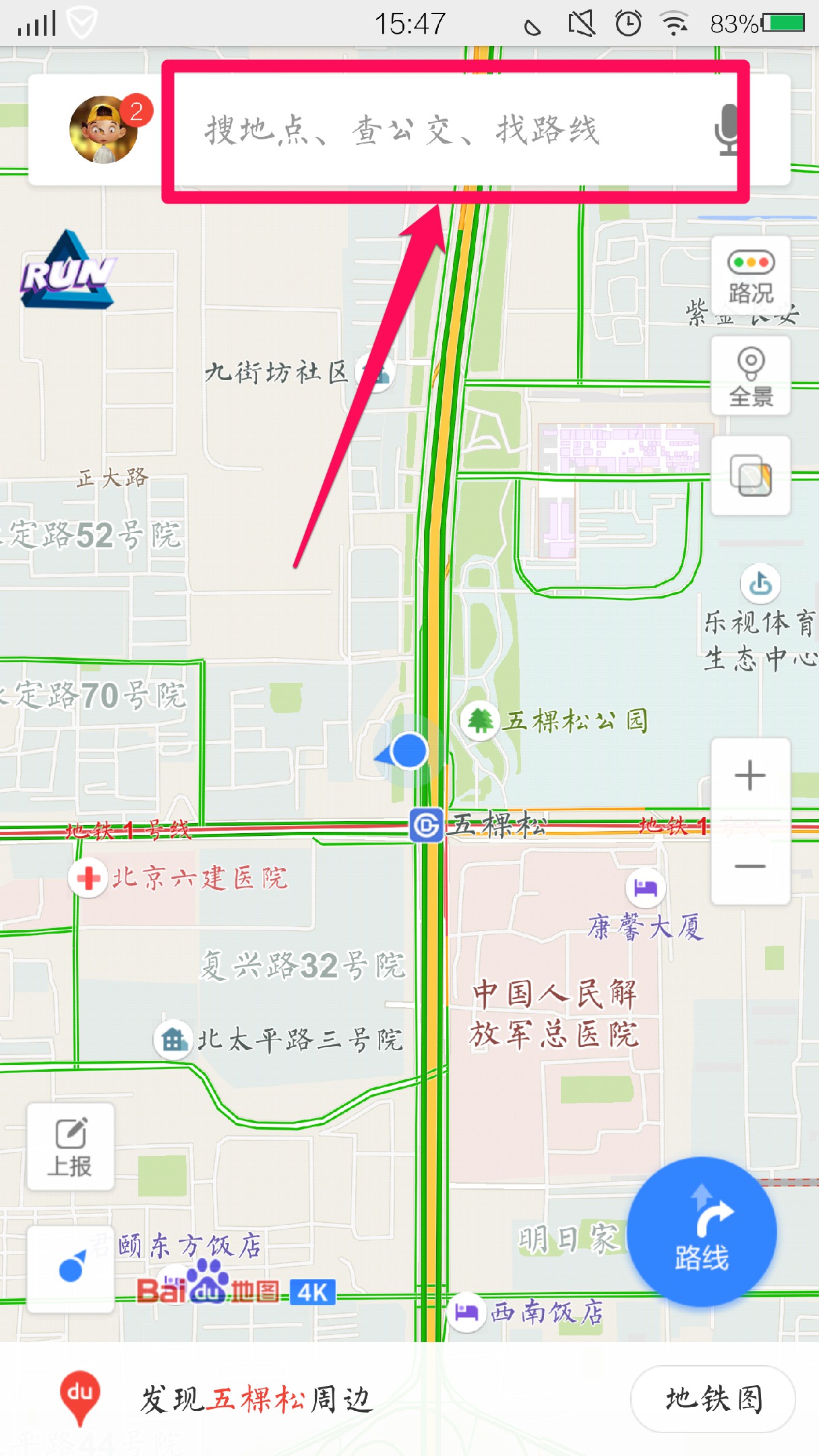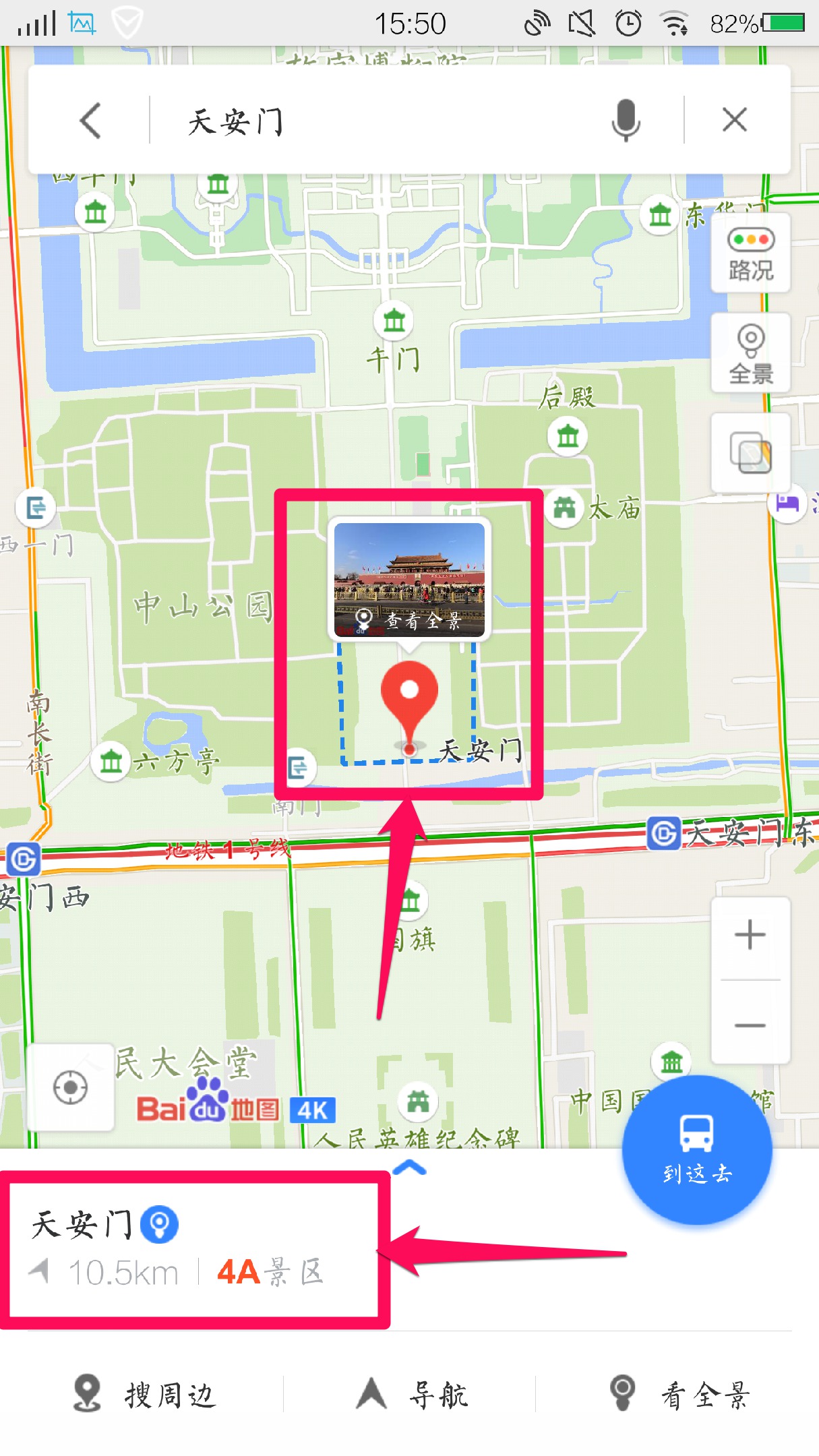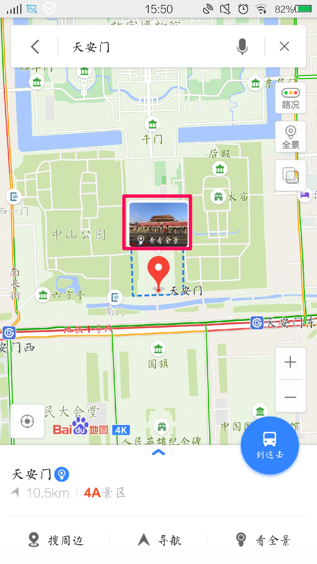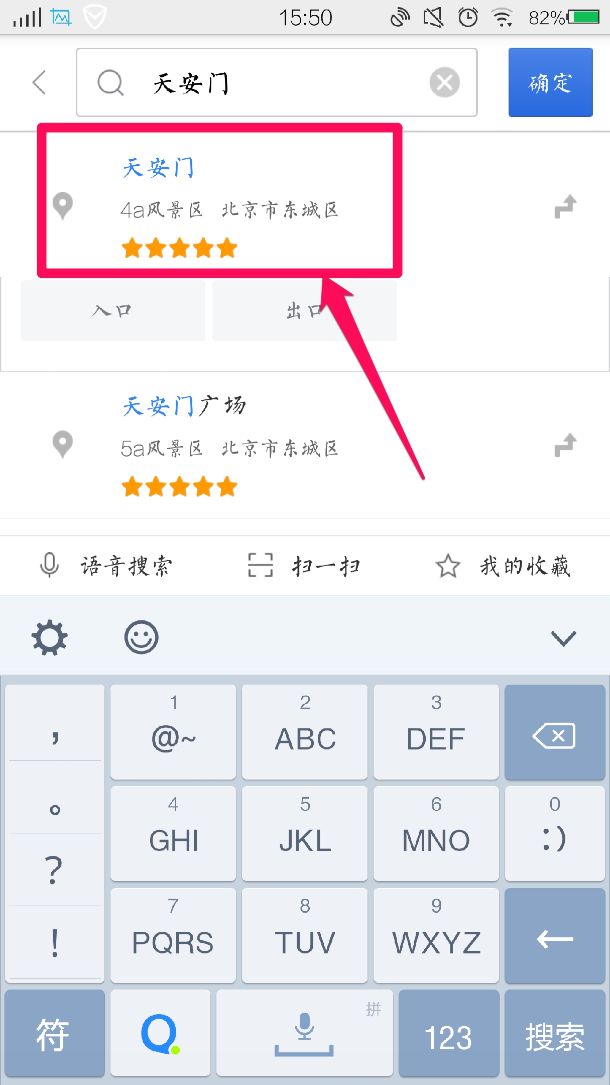 输入“天安门”,则下方会出现天安门的相关选项,点击第一个,进入目的地