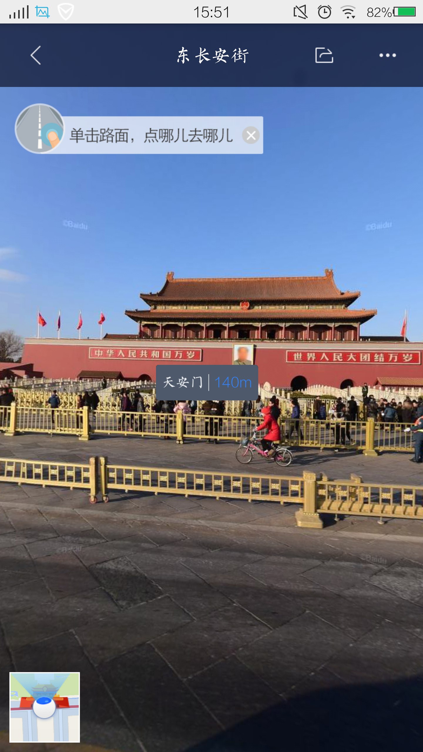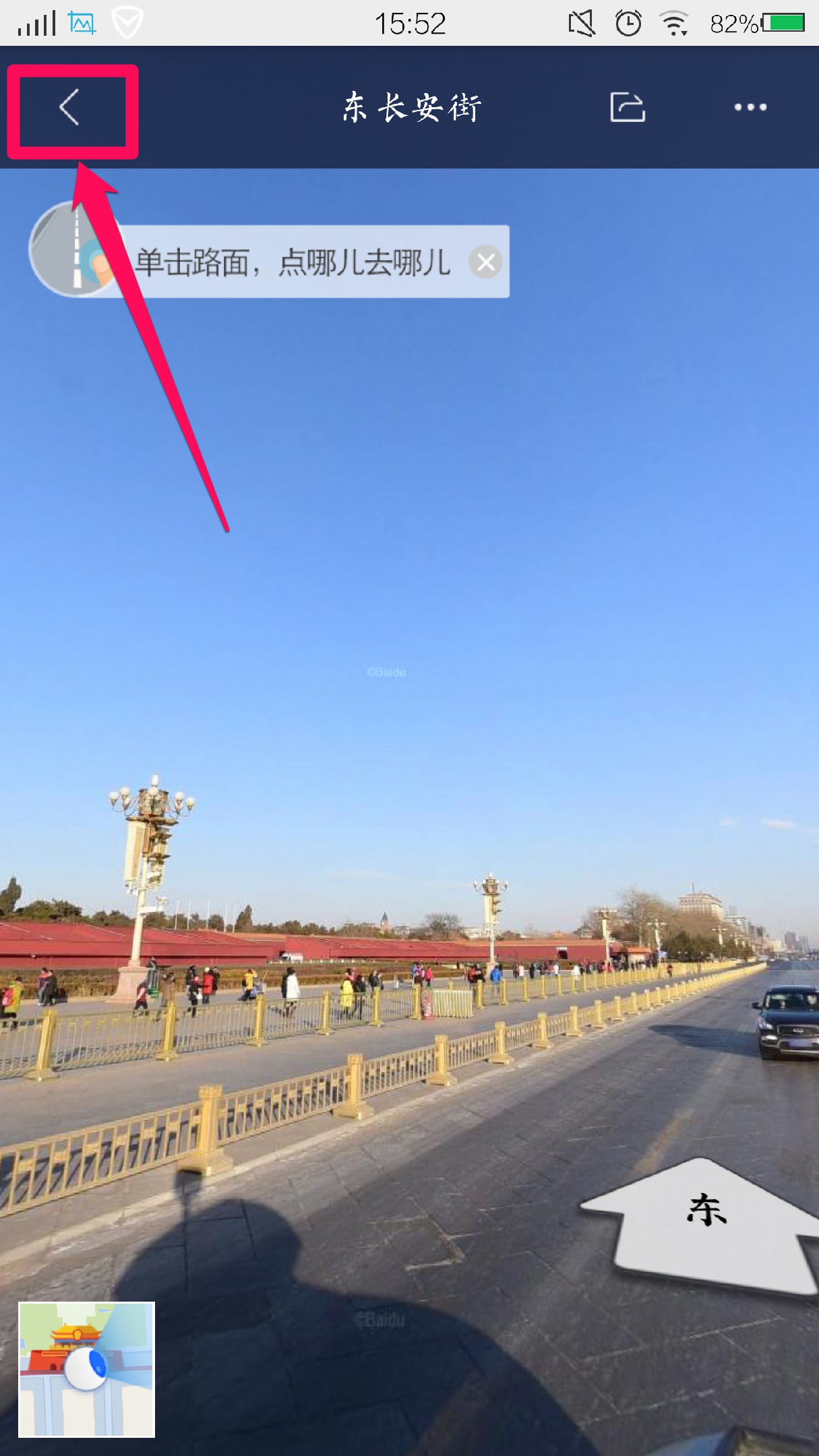 进入街景后,点击页面滑动,可以看到周围街景,比如,往左边划,代表你要往右边走