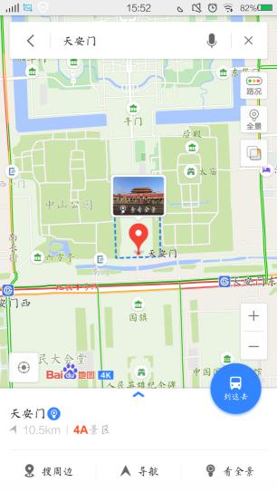 地图上将显示天安门的位置和你目前位置与天安门的距离等相关信息