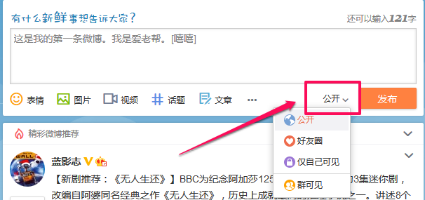 • 微博是一个开放的圈子,您发布的每一条微博都默认所有人可见。请切记保护好个人隐私,不要发布敏感或隐私内容